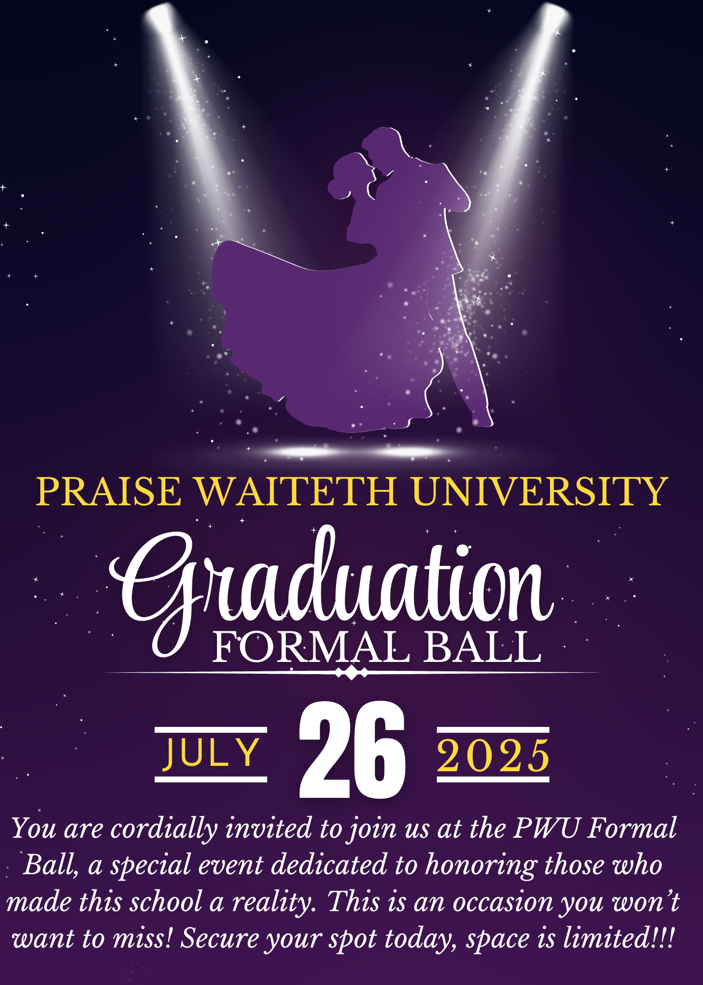 Our first annual Graduation Ball is underway! Grab your bowties, your formal gowns, and your dancing shoes and join us for a spin around the dancefloor! And don't forget to bring your appetites, it's a catered affair! Seats are limited so secure your tickets today!